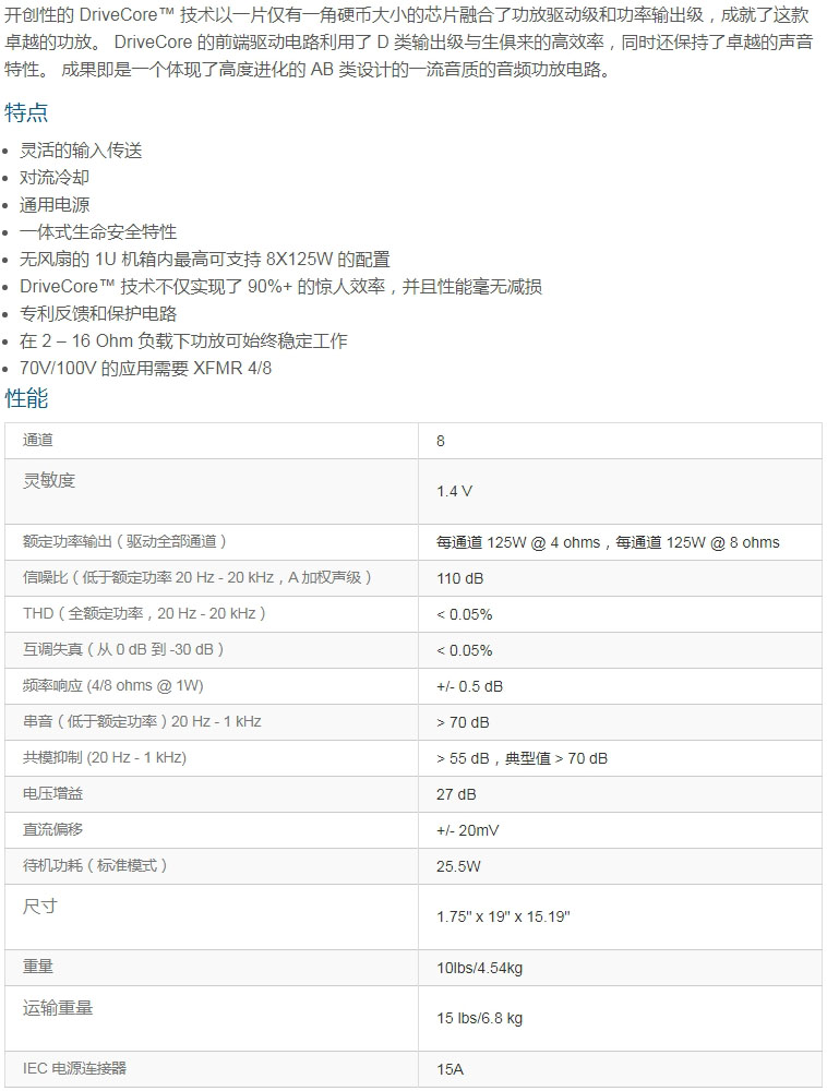八聲道、125W @ 4Ω 功放