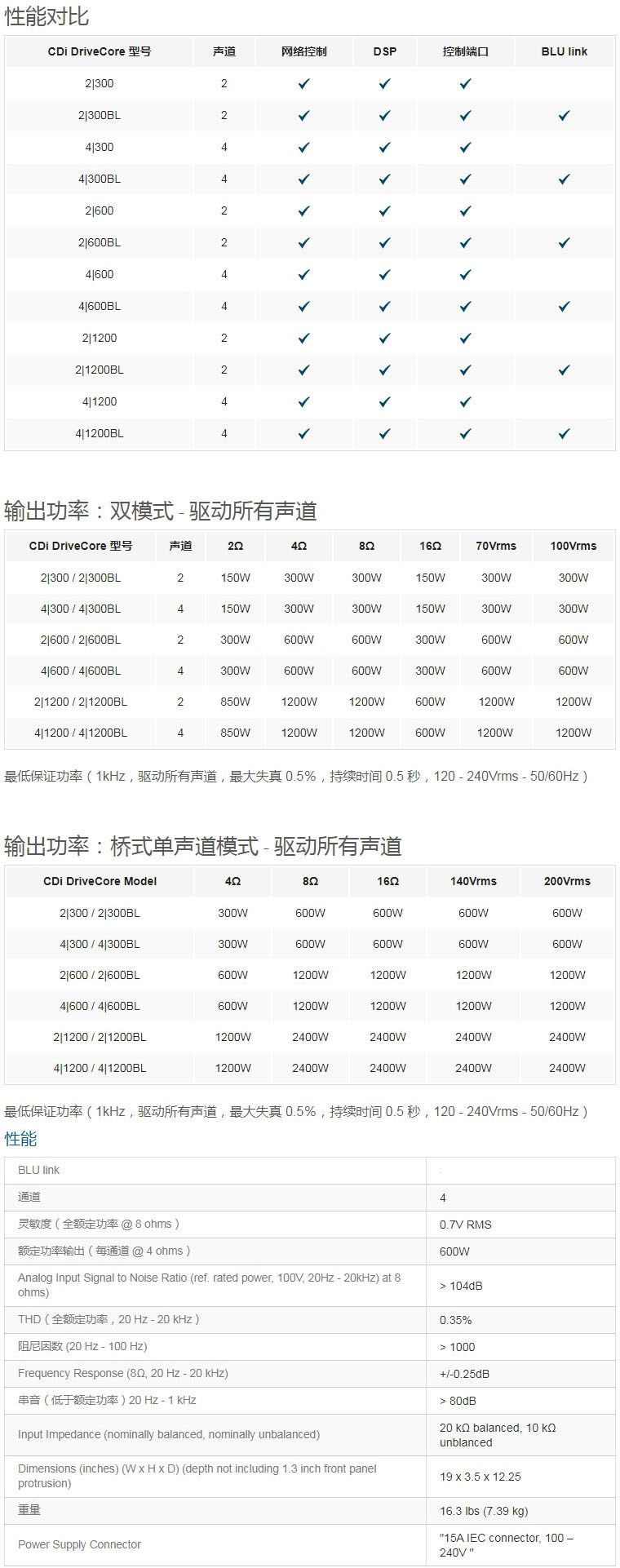 CDi DriveCore系列掀起了功放的革命性創(chuàng)新,呈現(xiàn)了令人刮目的高性能、豐富功能以及成本優(yōu)勢的完美組合。CDi DriveCore 4|600BL采用了固定安裝功放旗艦產(chǎn)品(Crown DriveCore Install系列)的技術(shù),可提供簡化的功能,適用于中型安裝場景,如電影院、教堂、酒吧、酒廊等。4|600BL專為輕松適應(yīng)各種應(yīng)用而設(shè)計,是一款四聲道功放,其包含網(wǎng)絡(luò)控制/監(jiān)控、高級DSP、前面板接口,并支持驅(qū)動高達100Vrms的揚聲器負(fù)載而無需變壓器。4|600BL帶有BLU link鏈路,增加了通過HARMAN的數(shù)字音頻總線發(fā)送和接收頻道的功能。整個CDi DriveCore系列預(yù)裝了JBL揚聲器調(diào)音裝置,可幫助您更快更輕松地完成安裝。